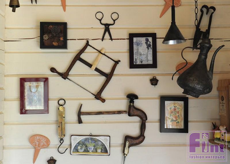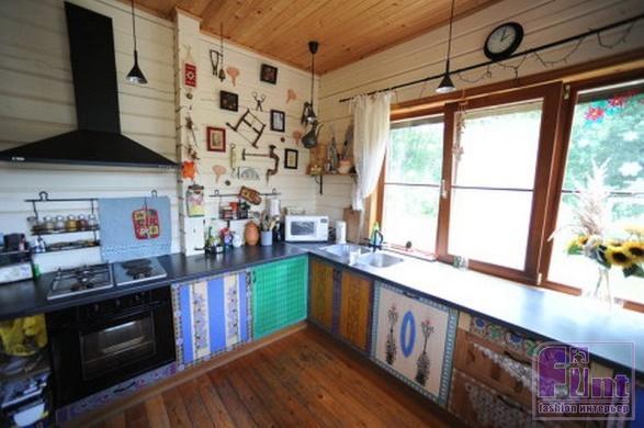 Кухня оформлена в очень необычном русском цветочном стиле. Всю мебель здесь собственноручно расписала жена Максима - Татьяна. Одна из стен украшена необычными предметами: старинными ножницами, картинками и старинными столярными инструментами.