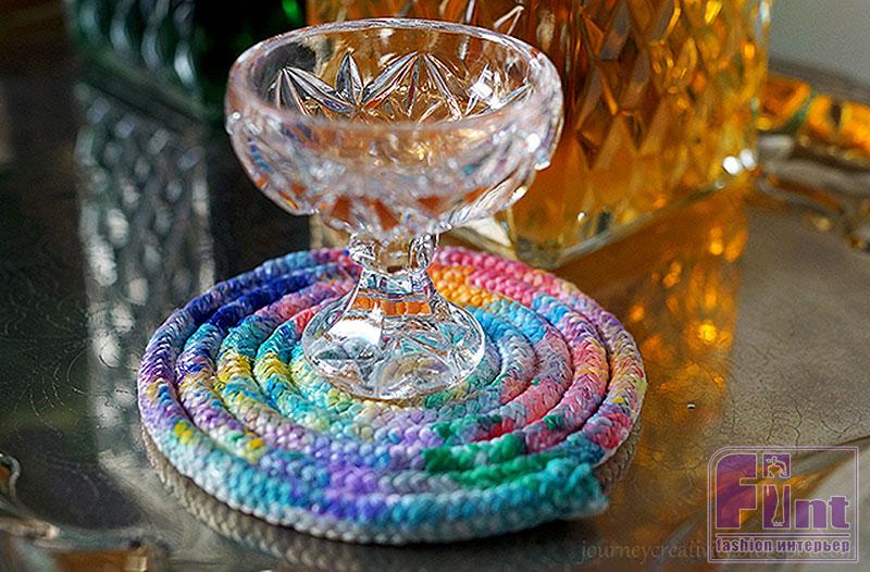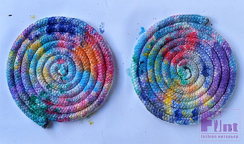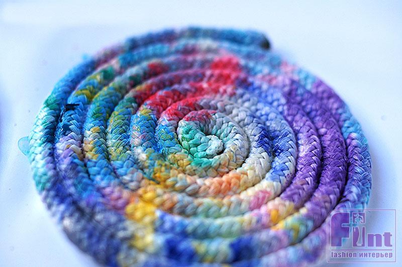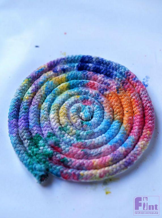 Помимо чисто эстетического свойства, наш аксессуар несёт в себе и вполне утилитарные качества, поскольку сегодня мы с вами будем изготавливать своими руками необычную подставку под горячее из самой обычной верёвки. Для работы нам потребуется: довольно толстая синтетическая плетёная верёвка чистого белого цвета диаметром от 0,5 до 10 мм, ножницы или канцелярский нож, моментальный «секундный» клей, яркие акриловые краски нескольких цветов, кисти и обычная зажигалка.