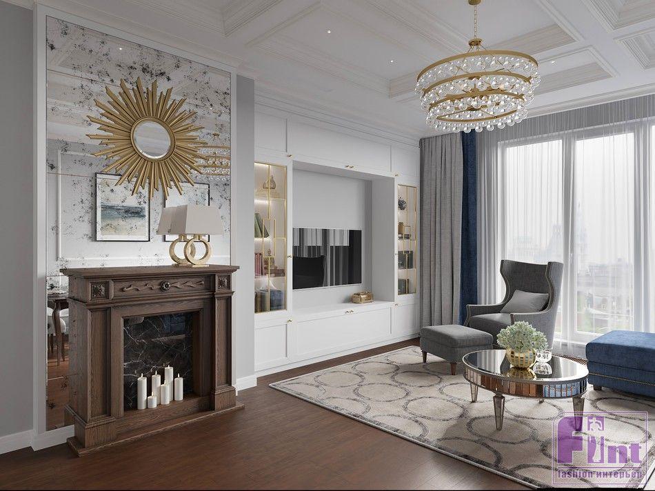 Ключевым элементом гостиной дизайнеры называют каминный портал на фоне состаренного зеркала. Камин сделан из массива дерева ручной работы. Над камином висит невероятно популярное в последние годы зеркало-солнце в эклектичном багете, рядом располагается композиция из витрин, фасады которых украшены стеклянными витражами. Напротив композиции для ТВ стоит классическое кресло и диван простой современной формы.