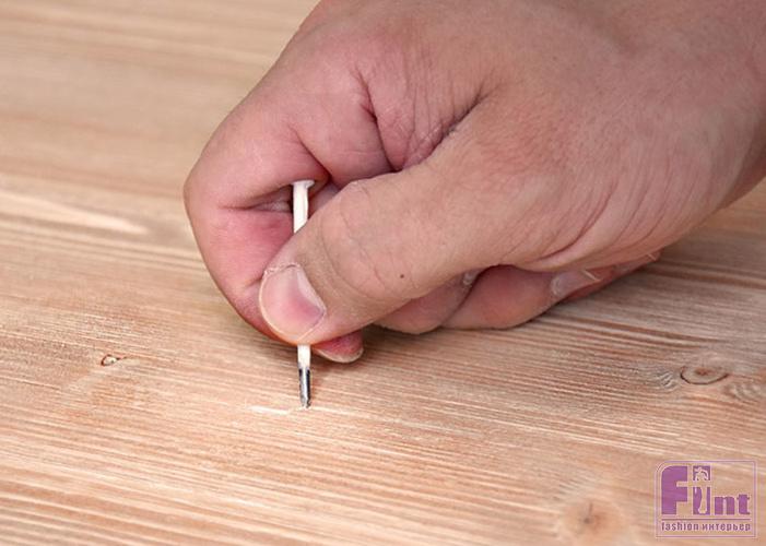 Неглубоко вбейте в некоторых местах на поверхности мебели по гвоздю. Потом выньте гвозди. Можно даже просто с усилием вдавливать гвозди в дерево, создавая круглые отверстия. Так у вас получатся «следы от червоточины». Эти отверстия тоже не должны располагаться равномерно. Просто сделайте в одном-двух местах небольшие группы из таких искусственных червоточин.