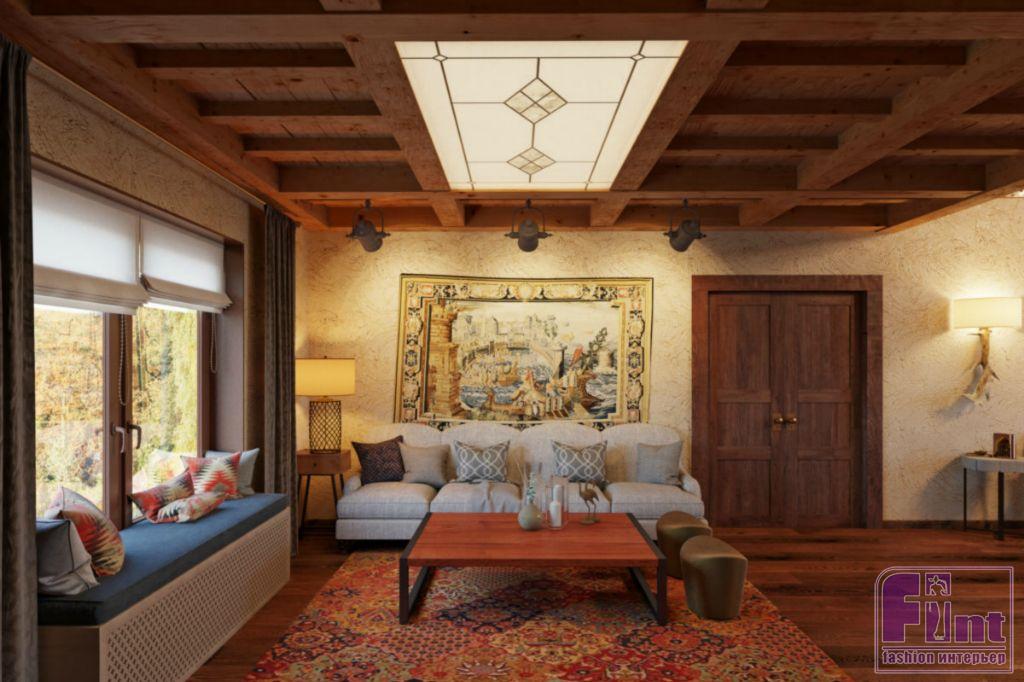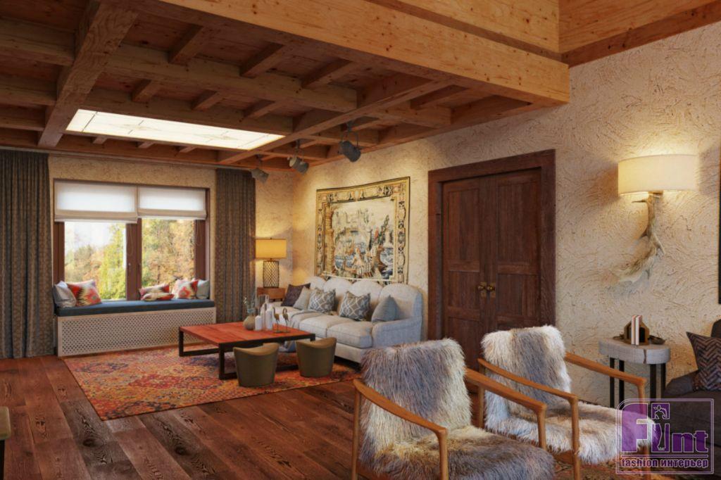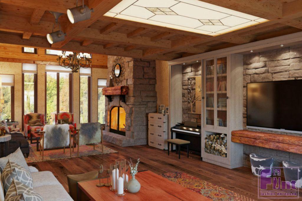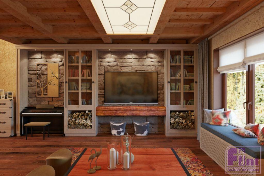 Наряду с возможностью гармонично «вписать» самые разные предметы, большое внимание заказчики уделяли многофункциональности пространства. Владельцы коттеджа хотели визуально обыграть неудобный для стиля шале телевизор и вписать в интерьер потолочный витраж с функцией светильника. В итоге, был разработан многофункциональный стеллаж, который является библиотекой, дровницей, местом для хранения мобильных пуфиков, пространством для цифрового пианино и самого телевизора. Потолочный витраж стал визуальным продолжением стеллажа и объединил пространство противоположных стен.