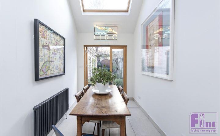 Весь интерьер экстремально узкого дома в Лондоне выполнен в стиле скандинавского минимализма. Доминирующий цвет отделки – белый, что не удивительно для дома с такими скромными габаритами. В доме весьма искусно решён вопрос освещения. Все этажи дома прекрасно освещены за счёт больших окон, а верхний этаж со спальней буквально «купается в свете» за счёт нескольких мансардных окон в кровле.