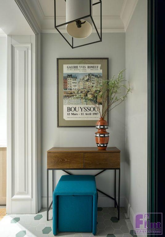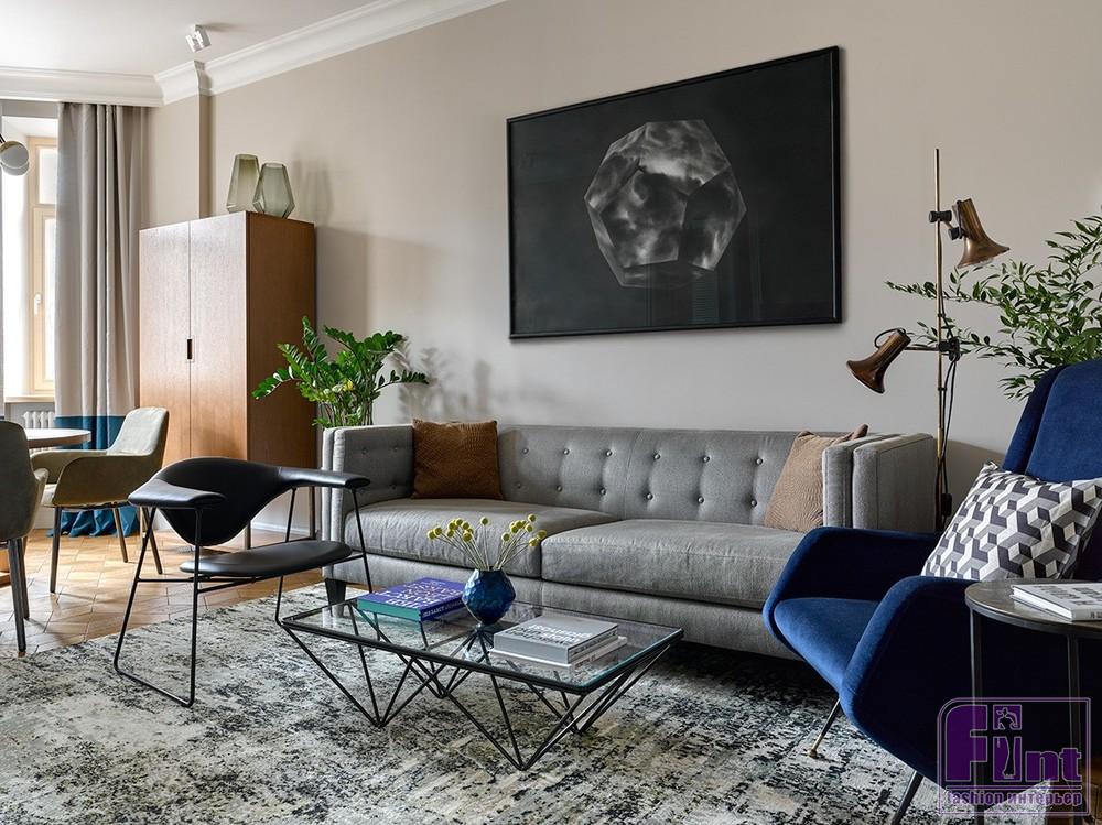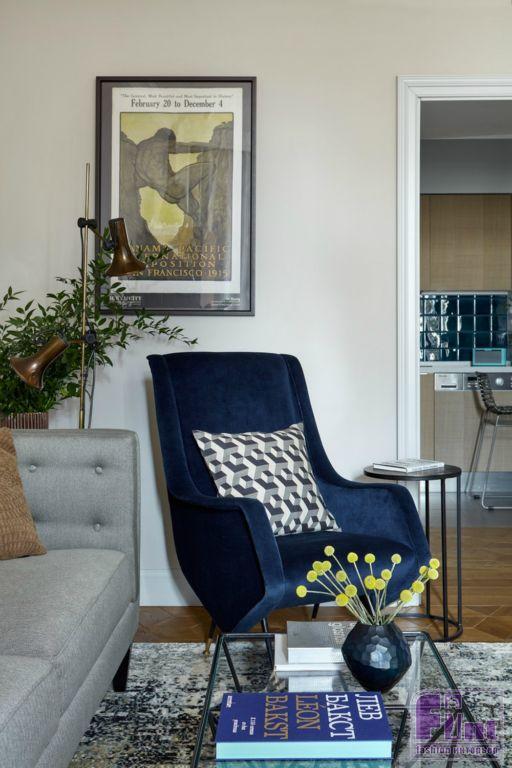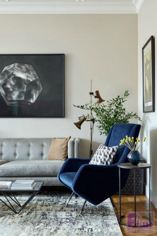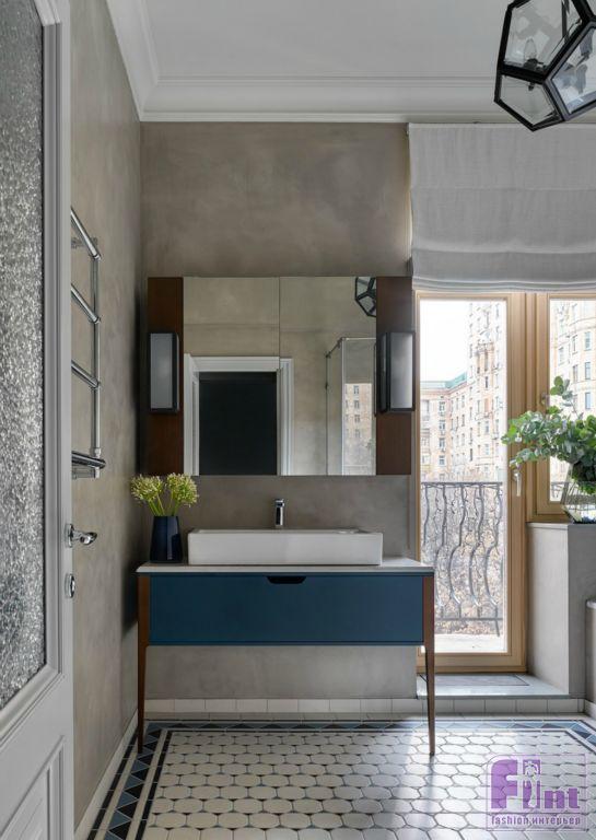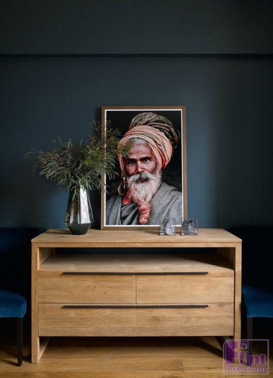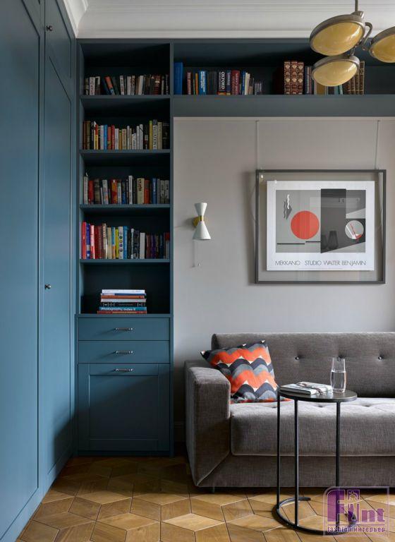 Это первое собственное жильё владельца квартиры, поэтому к обустройству пространства он подошёл внимательно. «На первую встречу заказчик принёс целый список своих пожеланий, — вспоминает Елена Минчева. — Так делает далеко не каждый». Хозяин просил передать в интерьерах дух Амстердама. Этот город ему хорошо известен, он часто бывает там во время рабочих командировок. А ещё — показал дизайнерам множество фотографий из путешествий: ему нравился микс винтажа и классики в глубоких тонах. Так в интерьере появились сложный синий, голубой, кофейный и зеленоватый оттенки — все их хозяин продумывал самостоятельно. Например, цвет стен в спальне он обозначил как оттенок глубокой морской волны.