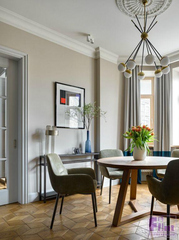 Столь же непреклонен заказчик был в отношении напольного покрытия. В гостиной он видел лишь фигурный паркет из дуба, который подходил по духу квартире в сталинском доме. Это была довольно дорогая покупка, остальные решения в интерьере вышли куда более бюджетными.