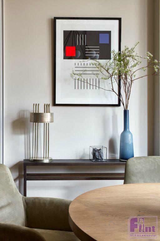 В проекте использовали винтажные предметы: итальянские светильники 1950-х и 1960-х годов, постеры того же периода и гипсовую розетку над обеденным столом. К слову, это единственное, что осталось от предыдущего интерьера. «Заказчик попросил отреставрировать розетку, но она рассыпалась на мелкие детали в руках рабочих. Легче было бы сделать новую, но хозяин квартиры стоял на своем», — вспоминают дизайнеры. Осколки принесли в мастерскую, где специалисты склеивали кусочки, заполняли промежутки гипсом и красили в цвет потолка. Сегодня розетка выглядит как новая.