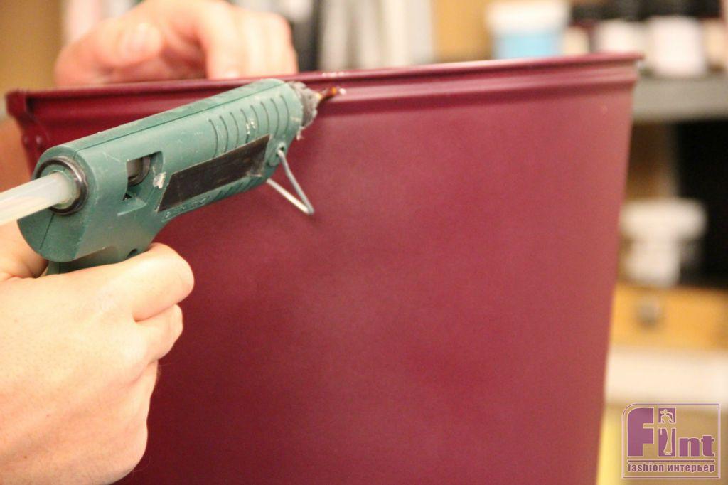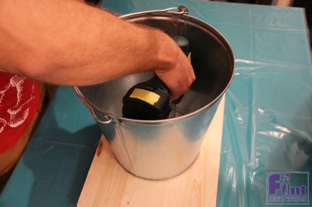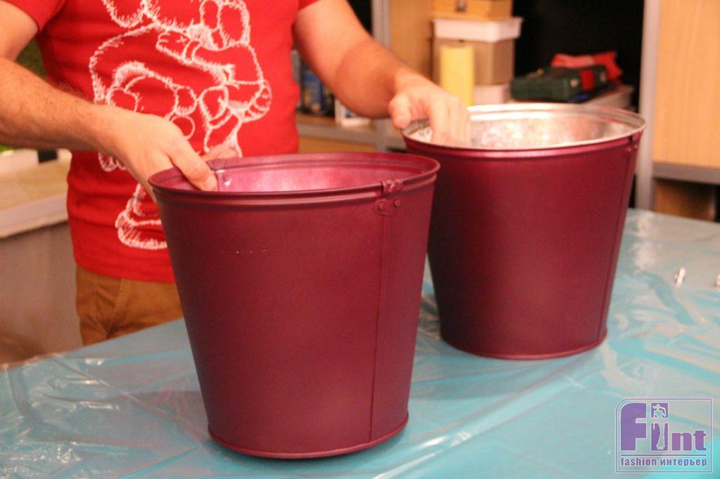 Окрашиваем ведра краской по металлу. Для этого лучше всего использовать аэрозольную краску в баллончиках, которую можно приобрести в автомагазине. Там продаются специальные эмали самых разных цветов и оттенков, предназначенные для профессионального окрашивания металла. Все покрасочные работы лучше проводить на открытом воздухе, не забыв защитить окружающие поверхности от брызг краски. При необходимости используйте резиновые перчатки, защитные очки и респиратор.