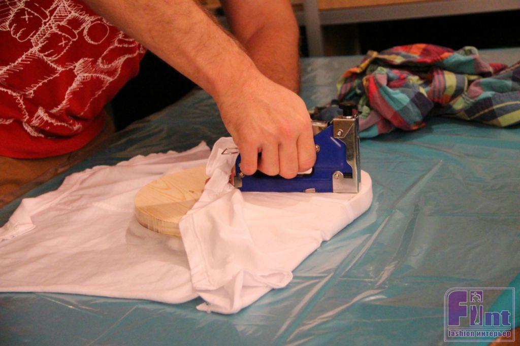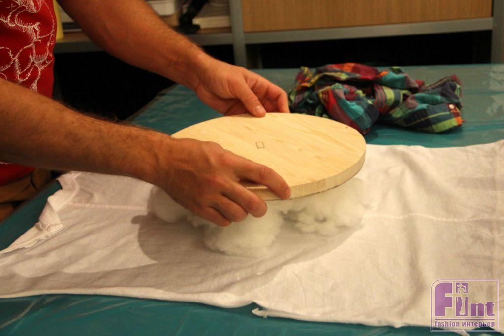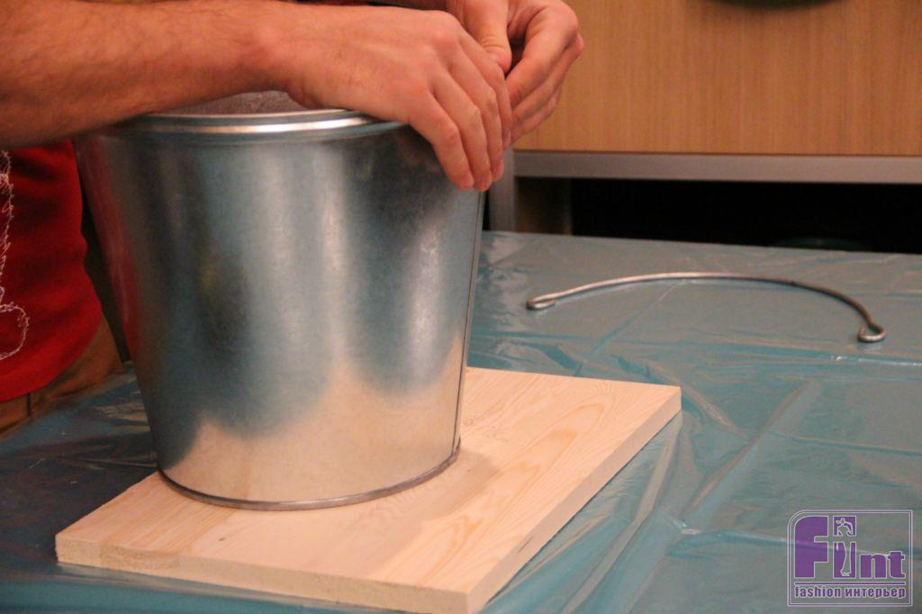 Используя электрический лобзик, вырезаем из толстой фанеры или деревянного щита круглую деталь по размеру окружности верхней части ведра. Распределяем по белой плотной ткани синтепон или укладываем вырезанный круг из мебельного поролона. Придавливаем «слоёную конструкцию» нашей круглой заготовкой и начинаем крепить ткань к основе, используя мебельный степлер.