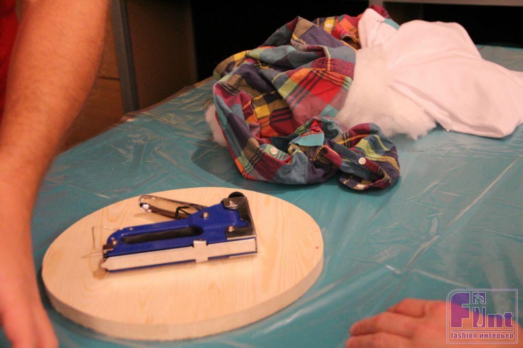 Старайтесь натягивать ткань равномерно. Сначала закрепите ткань крестообразно в 4 точках, а затем сделайте крепление в промежутках между вбитыми скобами. Излишки ткани срежьте с помощью обычных ножниц. Получившееся мягкое основания дополнительно обтягиваем мебельной тканью с клетчатым рисунком, закрепляя края ткани мебельным степлером.