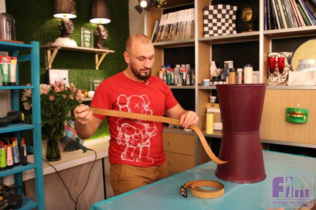 Нам осталось немного украсить наш табурет, чтобы придать ему стильный дизайнерский вид. Для этого мы будем использовать гладкие кожаные ремни. Отмерьте ремни по диаметру верхней части ведра, и отрежьте излишки. При необходимости, проделайте отверстие в ремне, чтобы он плотно «сел» на горловину ведра. Крепим ремни с помощью термопистолета.