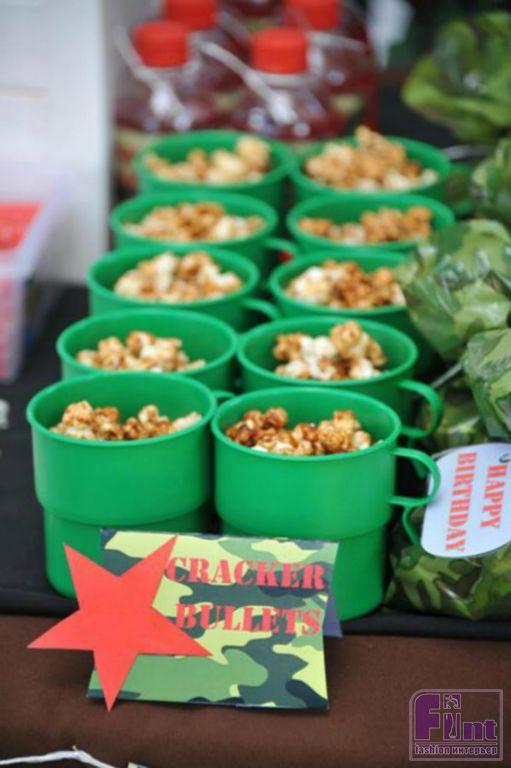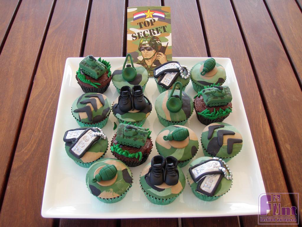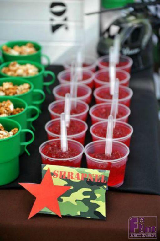 Их, кстати, можно выделить из общей массы посуды, расписав специальной краской по стеклу, которая продается в любом магазине для художников или для хобби. Оформите их в стиле «дембельского альбома» рисунками и крылатыми выражениями из армейского юмора. Не переживайте, краска легко отмывается. Также можно довольно легко использовать одноразовую посуду и салфетки в камуфляжной расцветке.