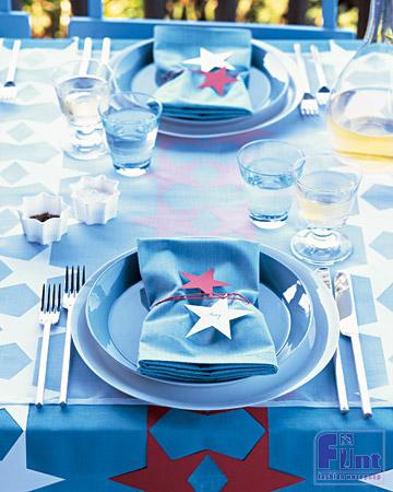 Очень часто советуют вместо скатерти стелить на стол флаг России. В ходе шумного застолья вы его неизбежно испачкаете – оставите следы тарелок, ножей, капнете красным вином; так что, из уважения к символике страны, лучше приобрести обычный отрез ткани оливкового, темно-зеленого или хаки цветов. А вот камуфляжная расцветка скатерти — плохая идея: вы как заправский разведчик «спрячете» на ней все блюда. Она затмит своей пестротой даже самый яркий салат, а прозрачные рюмки и бокалы вовсе не будет видно.