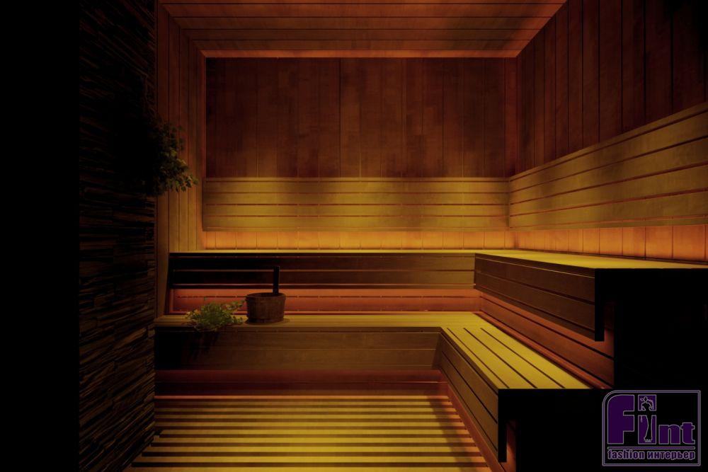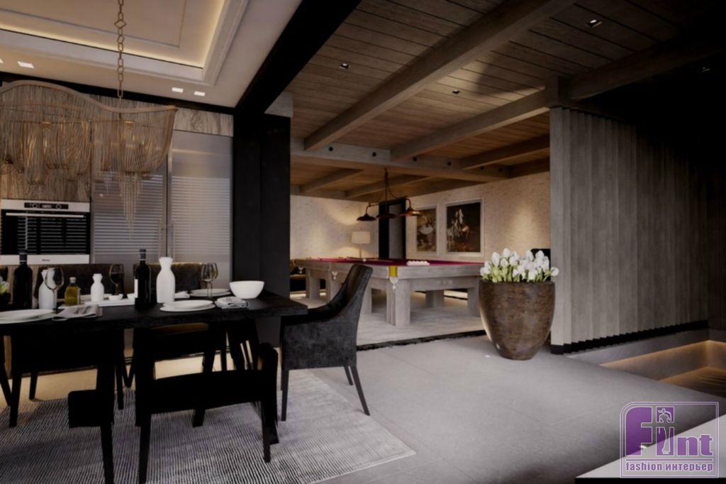 На проектируемой площади в соответствии с пожеланиями заказчиков обустроили совмещенную кухню-столовую, бильярдную, душевую, парную, хамам и гостевую спальню с небольшим санузлом. Сложность возникла только с окнами: зона с дневным светом была только одна — в ней разместили столовую и кухню.
