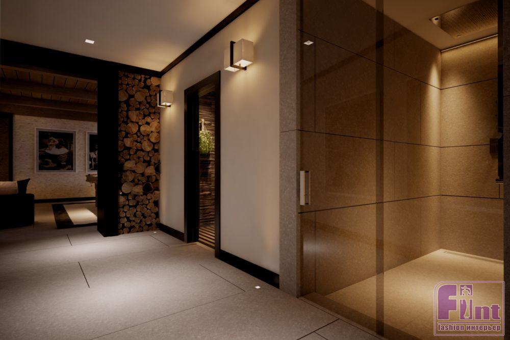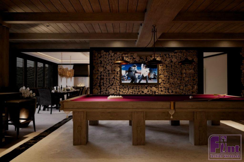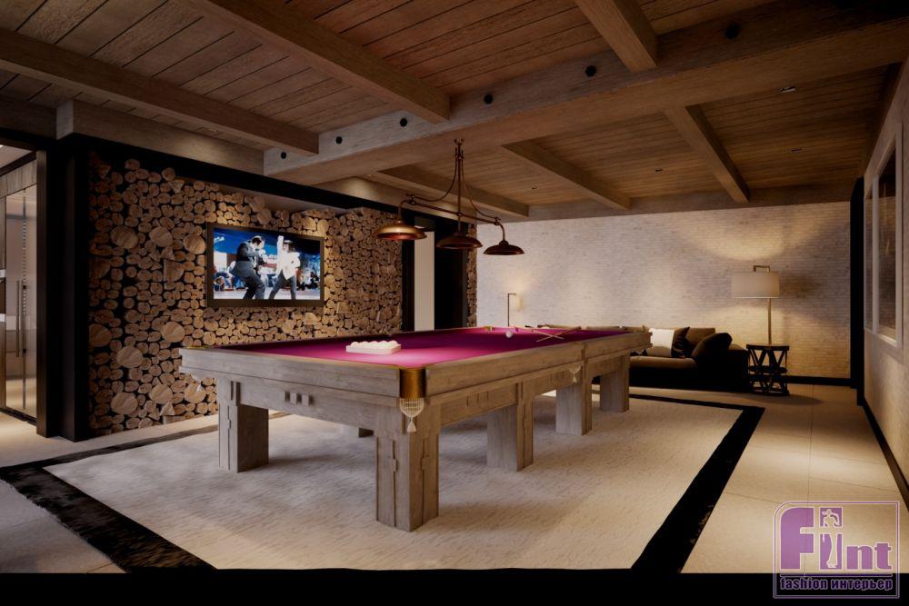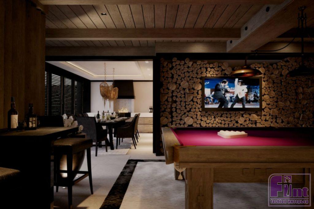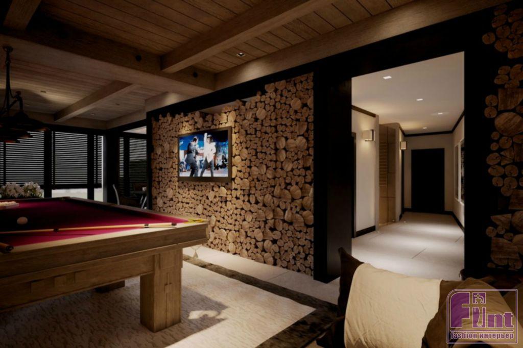 Для отделки основной стены в бильярдной зоне использовались деревянные цельные чурбаки вперемешку с колотыми дровами, помимо декоративных функций они имеют и функциональное назначение — ими топят печь в парной. Хотя, в целом эта поленница выполняет, конечно же, декоративную функцию, нежели утилитарную.