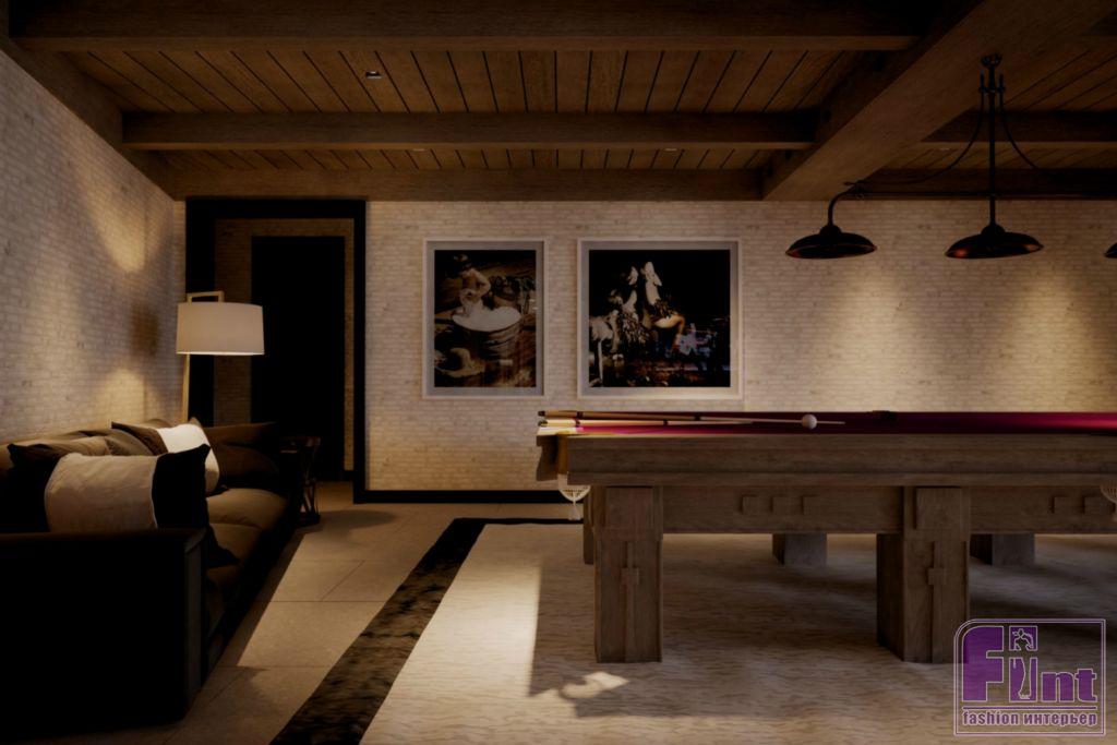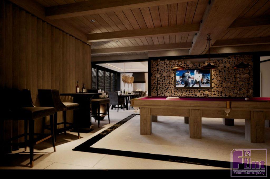 В итоге решили остановиться на популярном для загородного домостроения стиле шале, в подчеркнуто современном исполнении — с лаконичными прямыми линиями и нейтральной цветовой палитрой. Тепло, которое разливается по комнатам благодаря деревянной отделке и мягкому свету, оттеняется «холодом» натурального камня и кирпича — так интерьеру сообщается оптимальная «температура». Особенно ярко этот цветовой и фактурный баланс отмечается в бильярдной комнате. Здесь одна акцентная стена выполнена в виде поленницы из настоящих дров, а остальные отделаны декоративным клинкерным кирпичом мягкого бежевого оттенка.
