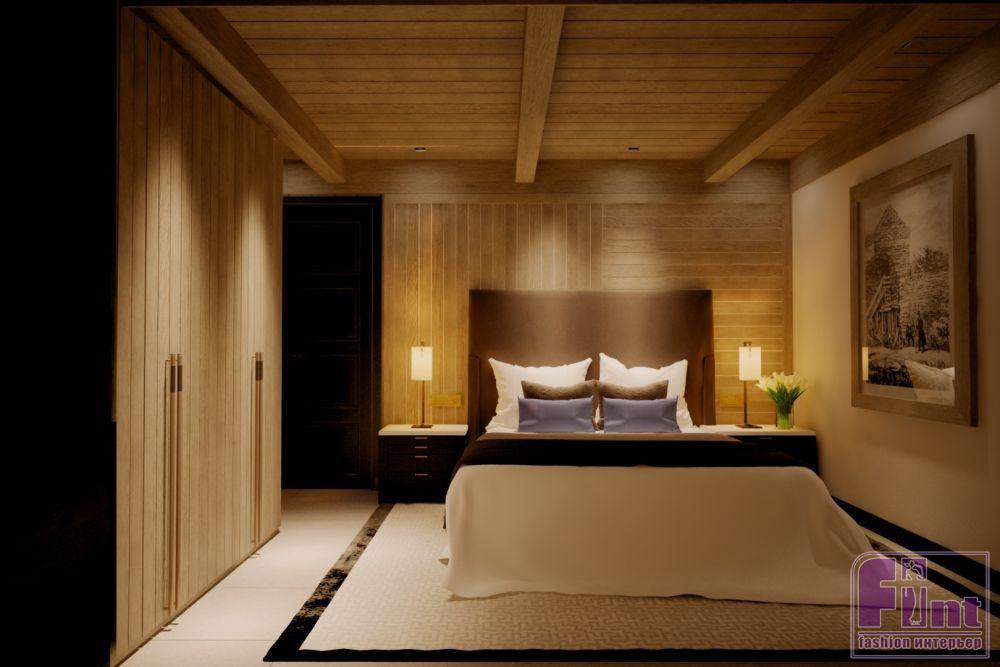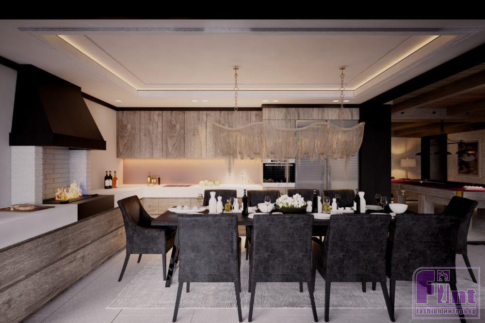 Стиль шале – это всегда много дерева: на полу, стенах и даже на потолках. Этот проект не стал исключением. Однако, для создания гармоничного баланса, в зоне СПА, а также в гостиной и кухне-столовой потолок решено было выполнить с помощью обычных гипсокартонных листов (ГКЛ), которые укрепили малярным стеклохолстом и покрасили краской на водной основе. Обустройство потолка из ГКЛ позволило сделать его в зоне кухни-столовой многоуровневым, добавив дополнительную скрытую подсветку.