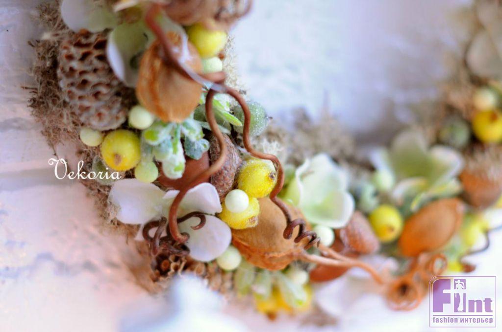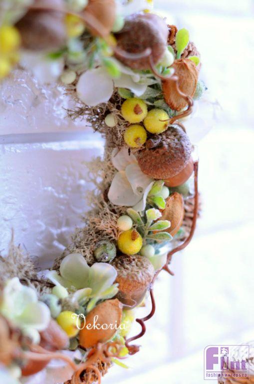 Приклейте по бокам венка морской мох. Добавьте косточки абрикоса. Приклейте ягоды жёлтого цвета, и прикрепите ягоды зёленого цвета.