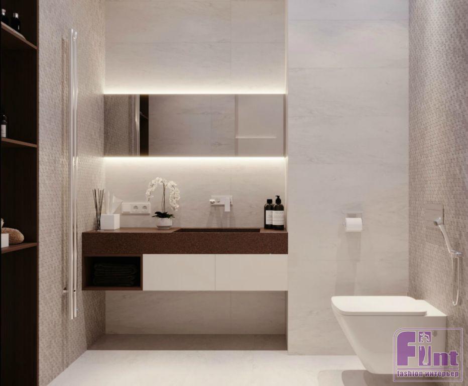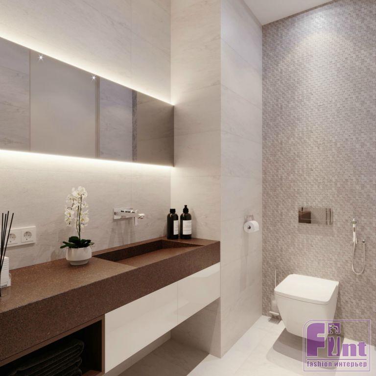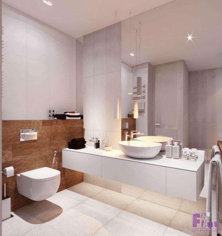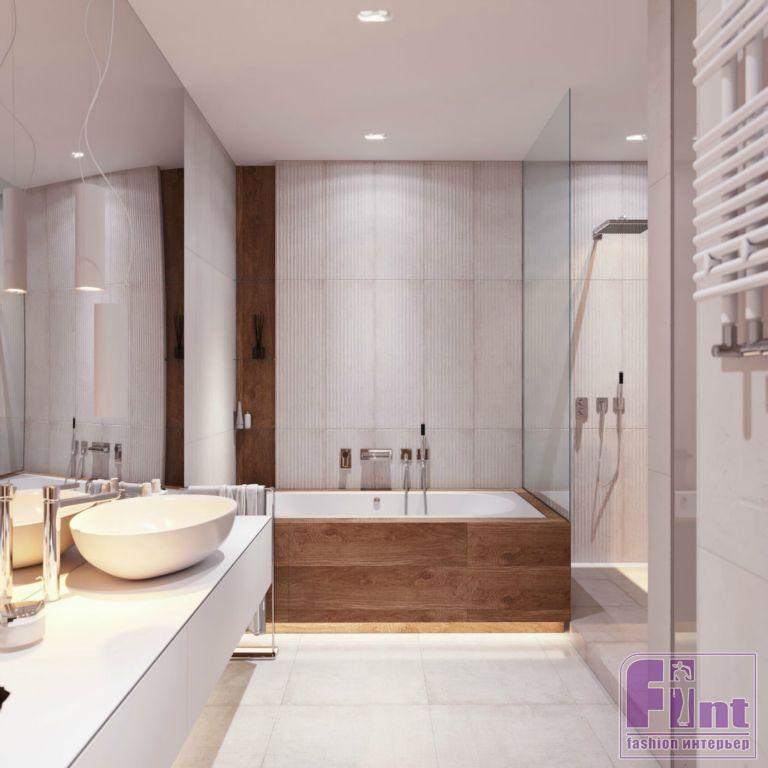 Плитку для санузлов и полов прихожей и кухни подобрали с учётом общей цветовой палитры проекта. При этом, по словам автора, в этом интерьере имеет значение каждая мелочь. В основе интерьера – дерево, камень и натуральные природные цвета.