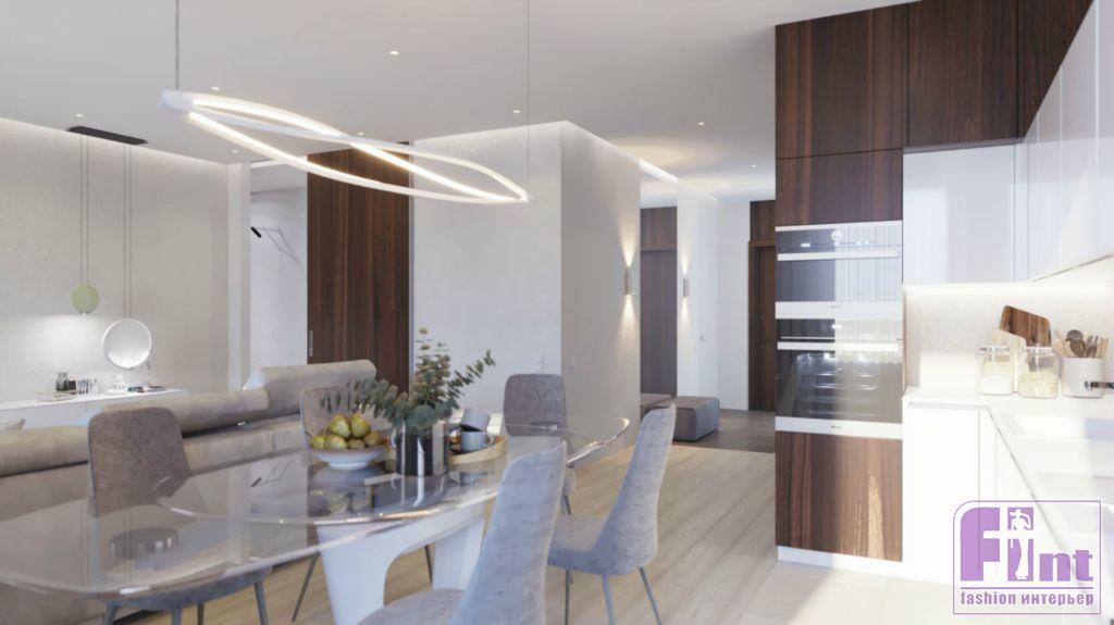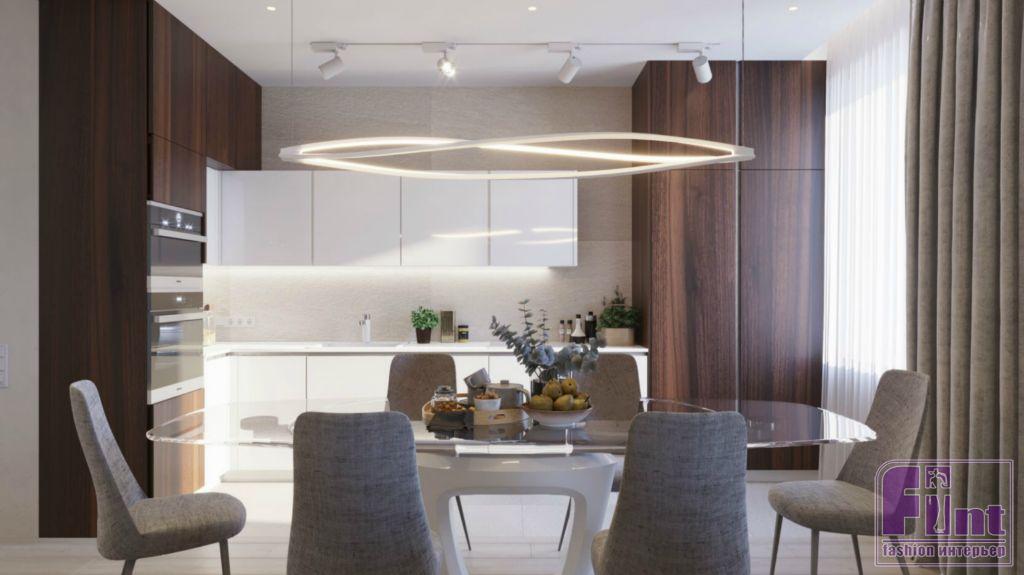 Обеденная зона в проекте выделяется продуманной планировкой и необычной схемой освещения. Рабочая кухонная часть зоны ярко подсвечивается потолочной трековой системой, а над обеденным стеклянным столом размещён потолочный светильник необычной формы в футуристическом стиле. «Космический» дизайн потолочного светильника отлично вписывается в лаконичный белый кухонный гарнитур и общую стилистику помещения кухни-гостиной.