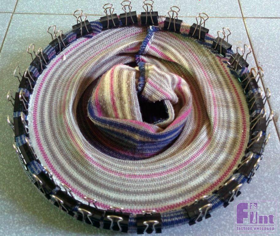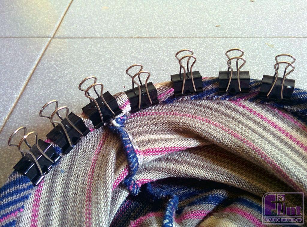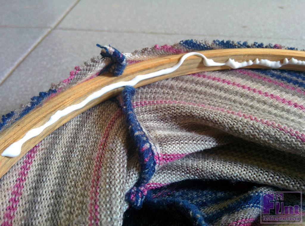 Отрежьте лишнюю ткань снизу, оставив только два сантиметра для подворота. Нанесите клей на внутреннюю сторону нижнего кольца и прижмите к ней ткань. Зафиксируйте зажимами и оставьте сохнуть.