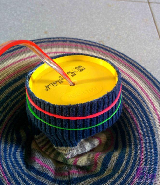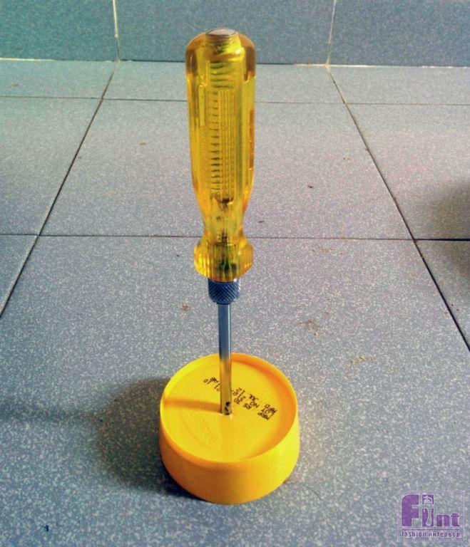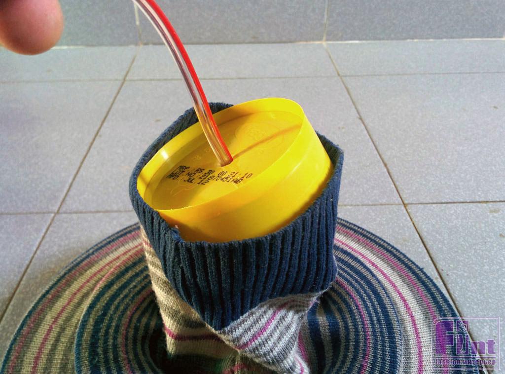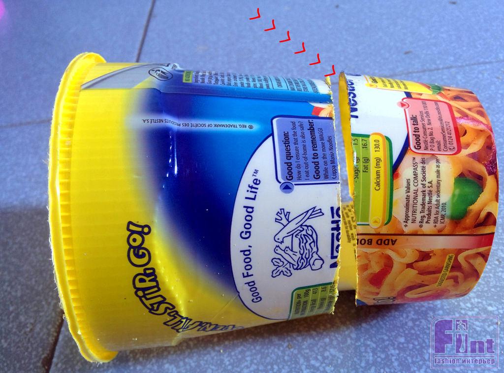 Пока клей сохнет, сделайте держатель для подвеса. С помощью острого ножа или ножниц отрежьте дно пластикового стаканчика. Затем проделайте в нём дырку для шнура (посередине). Вставьте шнур подвеса в отверстие.