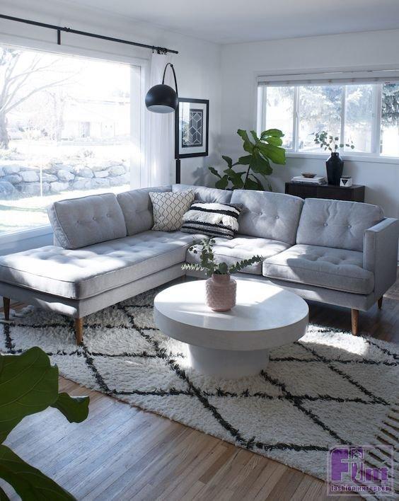 2. Угловой диван удобен тем, что к нему уже не нужна банкетка или пуф, на нём можно сидеть или полулежать. Есть компактные модели на 2–3 человека, и есть большие – на 5 и более.