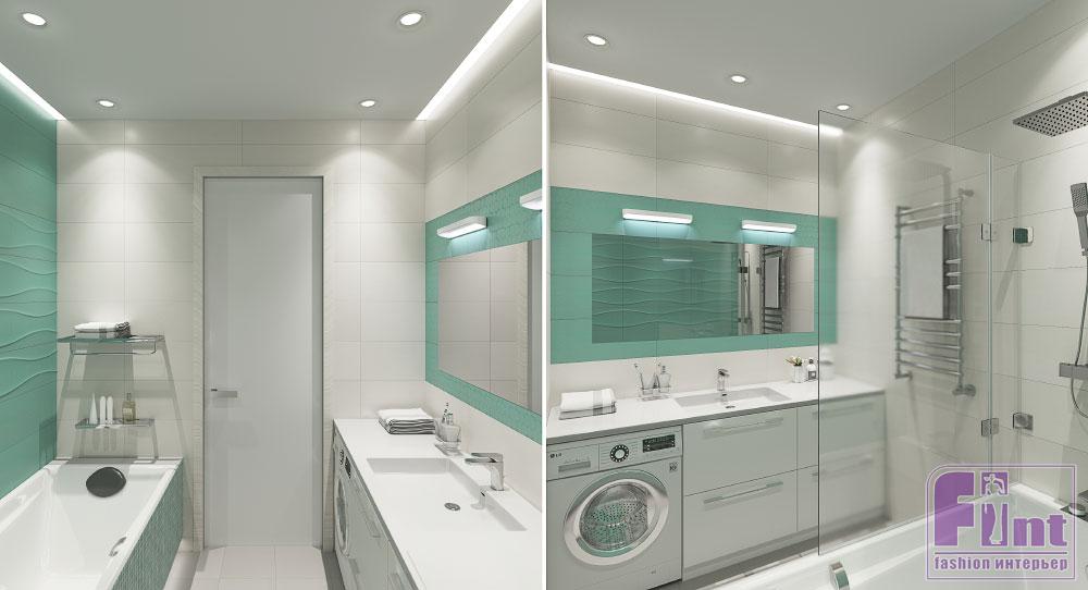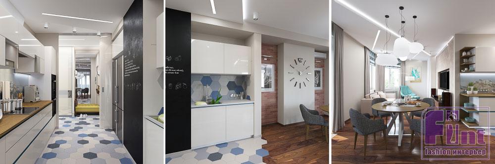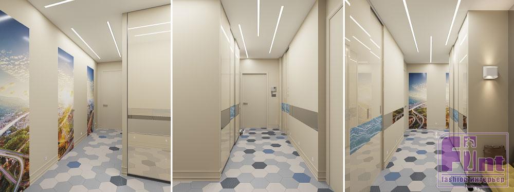 Созданию динамичного пространства «помогают» сменяющие друг друга элементы отделки и прямые линии, подчеркнутые зеркальными поверхностями и фотообоями, но всё же главную роль играет свет. Декоративные врезные светильники в кухне-гостиной навевают ассоциации с крылом самолета, а в прихожей напоминают световые указатели в салонах воздушных судов.