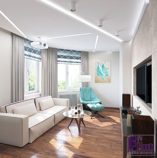 Потолок кухни и гостиной рисует в воображении крыло самолета. Линии и светильники создают иллюзию движения. Гостиная наполнена лёгкостью и уютом дорогого салона самолета – ощущение натурального дерева, мягких тканей, даже стена с телевизором отделана панелями из велюра. Гармония строится на контрастах фактур и цветов – светлые мягкие панели и гладкое чёрное стекло, деревянная столешница и металлические ножки. Многообразие освещения даёт возможность «играть» со светом, включая вечером мягкую подсветку крыла самолета или только ТВ-стены.
