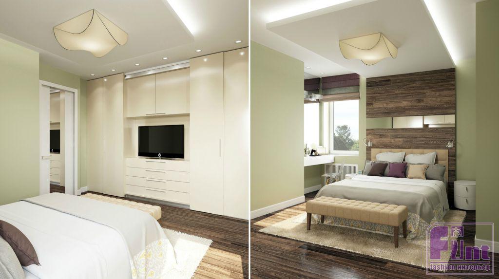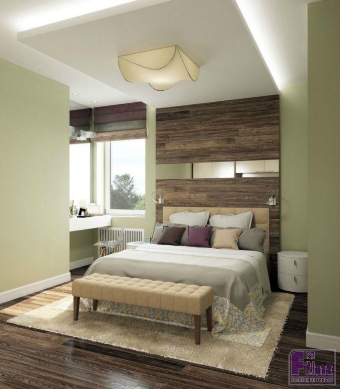 В спальне использовали тёплые карамельные и фисташковые оттенки. Для того чтобы обыграть стильное деревянное покрытие пола, стену за изголовьем кровати решено было обшить тем же ламинатом, создав пространство с заметной акцентной поверхностью. Чтобы массивная настенная панель из ламината не довлела над интерьером спальни, её выполнили из двух частей с «разрывом», роль которого отлично исполнило панорамное зеркало.