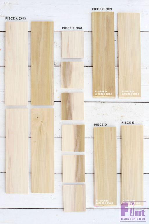 Шаг №1. Напилите дощечки по заданным размерам так, чтобы из 4 досок у вас получился квадрат, внутри которого поместились бы ещё 9 маленьких квадратов. Для крыши отмерьте дощечки так, чтобы у вас получились одинаковые концы «скатов» крыши, срезанные под углом 45°. Наш домик имеет «квадрат» внешних стен, потолка и пола – 45 см, а внутренние ячейки-полки получились по 15 см, что позволяет легко разместить на них стандартные кружки и чашки.