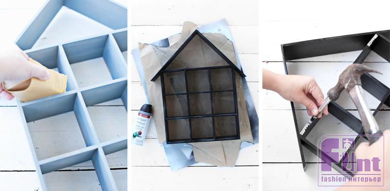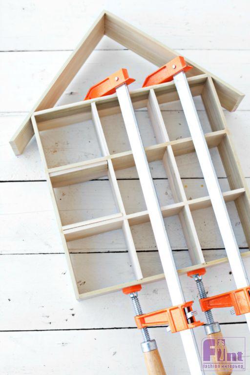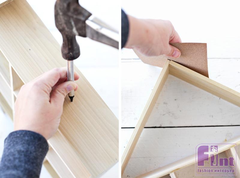 Шаг №3. Наша полка собрана и склеена. Теперь необходимо усилить её конструкцию, вбив несколько небольших гвоздей в места соединений, которые будут испытывать основную нагрузку. Это соединение горизонтальных полок со «стенами», все внешние углы «домика» и места соединения «домика» и «крыши». Старайтесь вбивать гвозди аккуратно, чтобы наша конструкция не развалилась от ударов молотка.