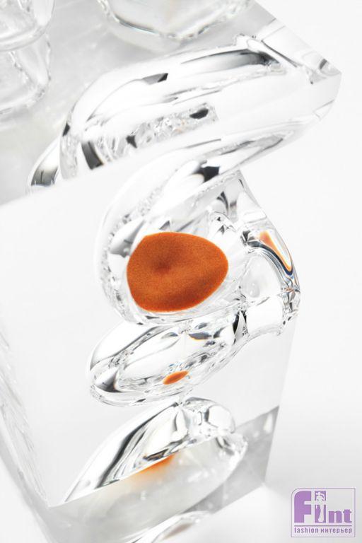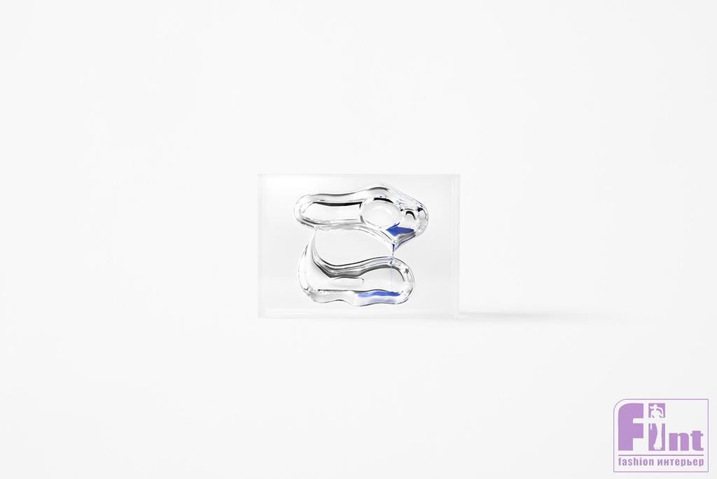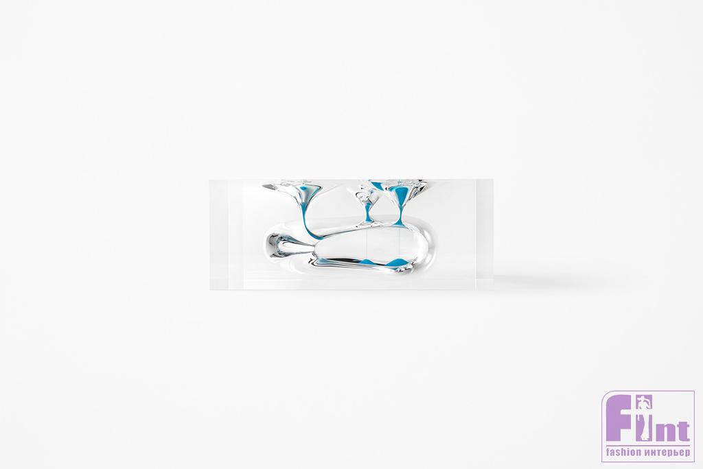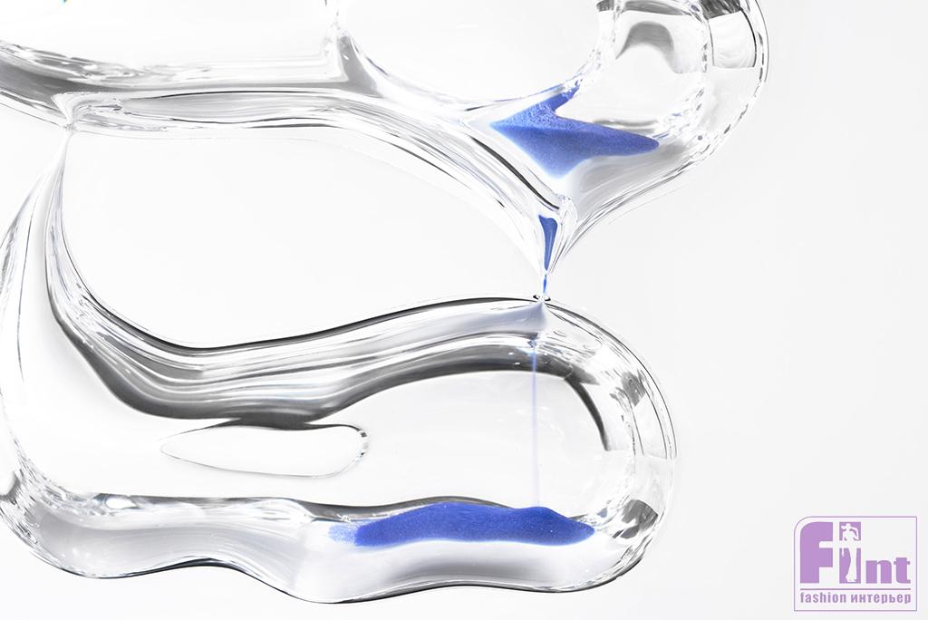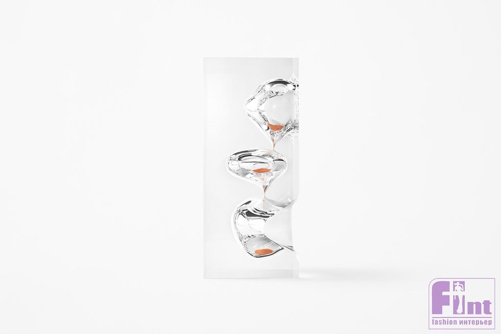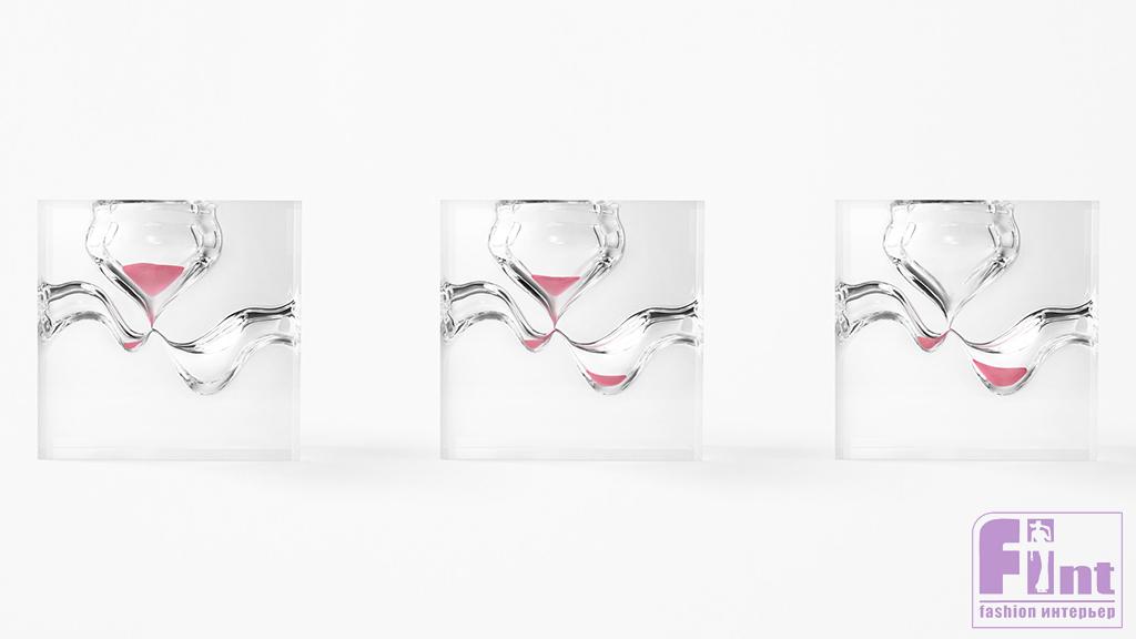 Развивая эту идею, дизайнеры решили художественно «оформить» сам поток времени и создали часы-скульптуры из прозрачного акрила. Внутри акриловых глыб они выточили аморфные пещеры, углубления и желоба, сквозь которые пустили песок ярко-синего, оранжевого и розового цвета.