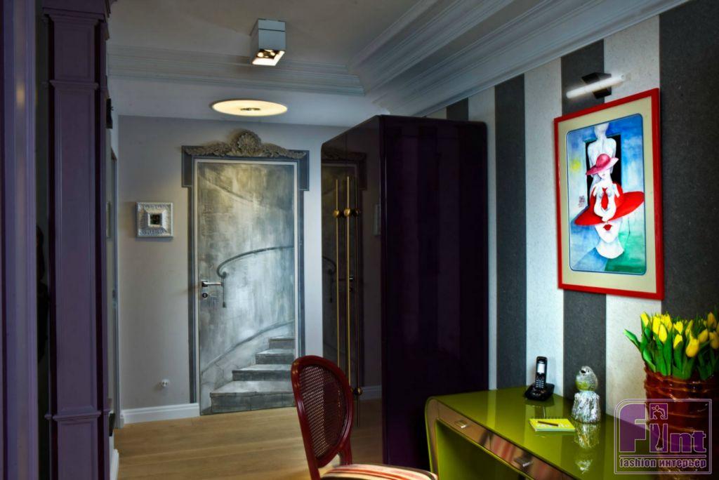 Посмотрите на удачный декоративный приём на фото — ничего лишнего в этом коридоре нет, но торец стены (простенок) выделен ярким панно. Такое решение позволило не только украсить саму картинку, но и подчинить себе геометрию помещения, сделав его более «квадратным». В роли панно может выступать любой отрез яркой ткани, натянутый на подрамник.