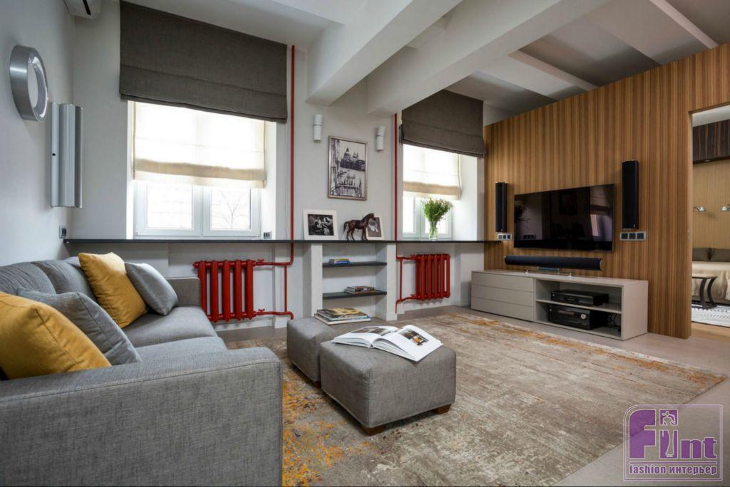 Ещё одно решение «проблемы батарей» — монтаж в декоративных экранах из МДФ или фанеры со специальными отверстиями для свободной циркуляции воздушных потоков. Такие экраны-накладки монтируются под подоконником, почти полностью закрывая батарею, и одновременно выступают в роли украшения оконного ансамбля. Попробуйте представить гостиную на фото без экрана на радиатор.