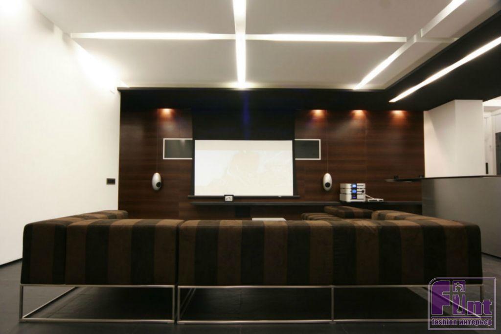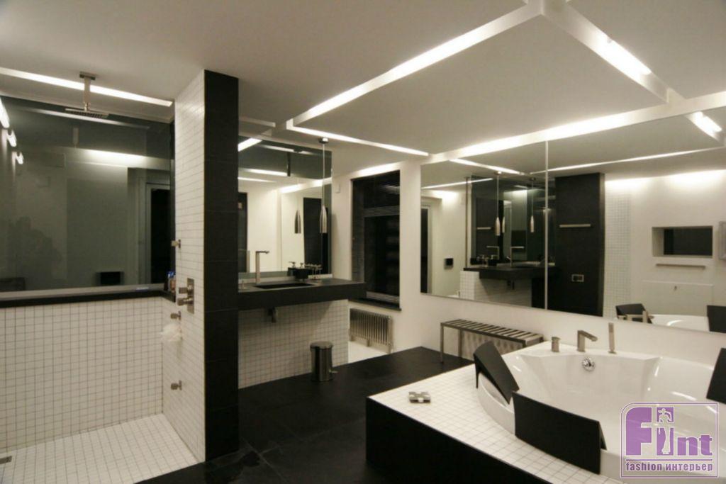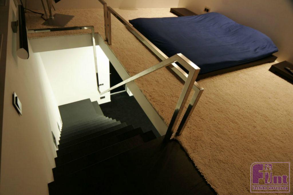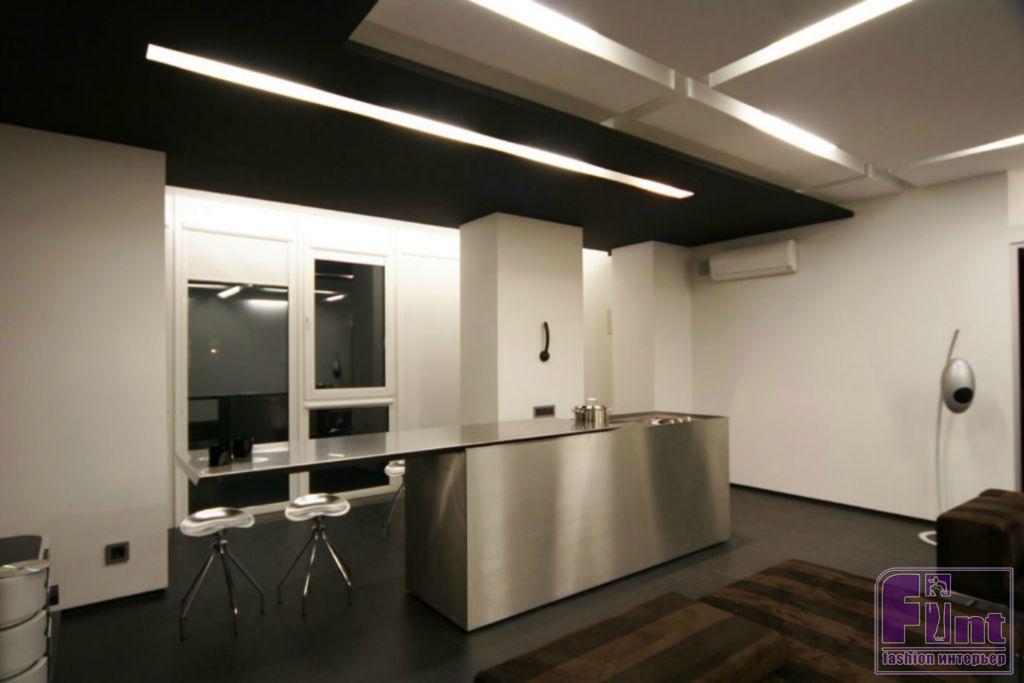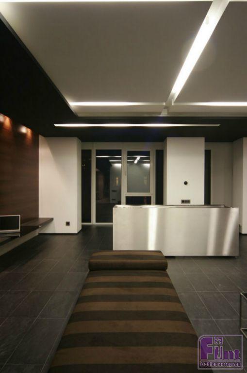 Для реализации творческого замысла и пожеланий заказчика, Елена решила обратиться к стилю минимализм, в котором выполнено всё пространство огромной квартиры с мансардой. Особого внимания заслуживает тщательно продуманная дизайнером довольно необычная система освещения. Все осветительные приборы спрятаны в специальные потолочные ниши, которые разрезают пространство комнат на ровные объёмные квадраты. Стремительные потолочные линии отлично адаптируют довольно обширные площади помещений для более комфортного восприятия.