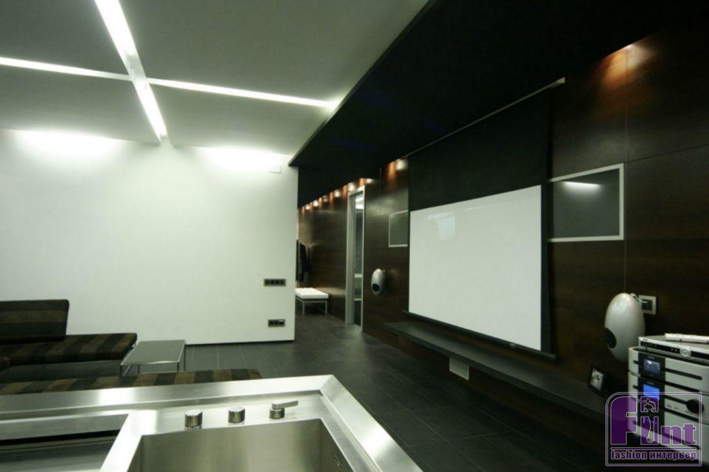 Оригинальные решения начинаются прямо с порога: первое, что видишь, войдя в квартиру, — это домашний кинотеатр, ставший композиционным центром гостиной. На полу — чёрный сланец, не часто применяющийся в отделке. Здесь же смонтирована кухня-трансформер, за блестящими фасадами которой прячется весь необходимый набор, включая раковину, варочную панель, холодильник и духовку. Реализация такой своеобразной «кухни-невидимки» стало данью выбранному стилю минимализм и позволило обеспечить квартиру более чем полноценной зоной для приготовления и приёма пищи.