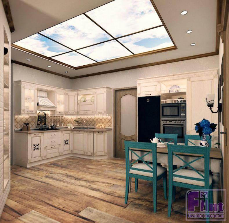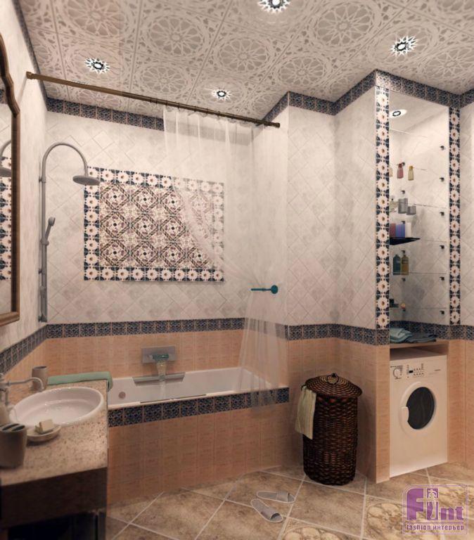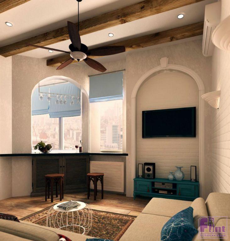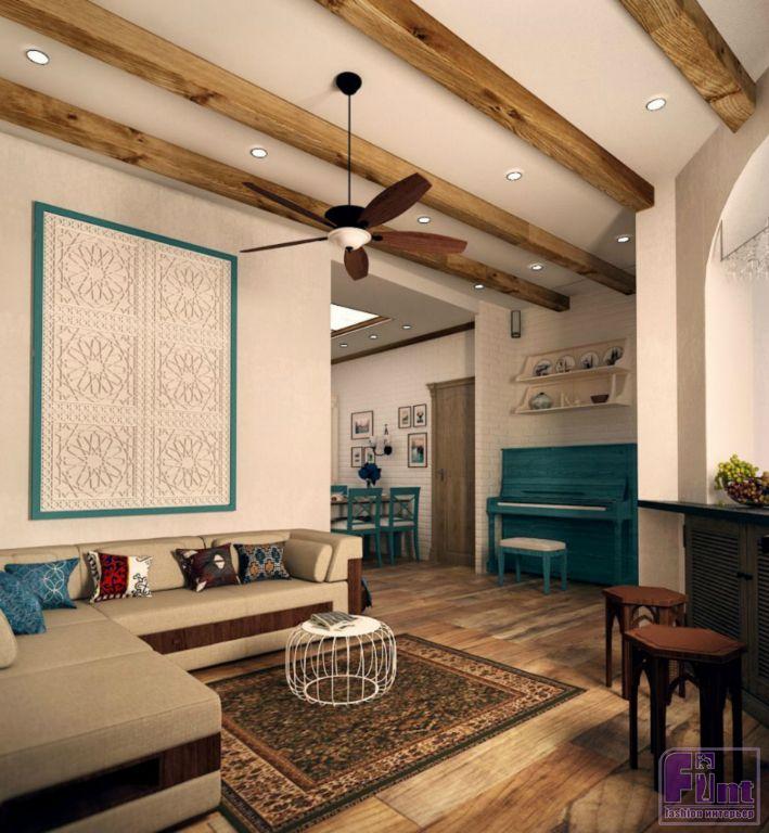 В проекте использовались характерные для средиземноморского стиля элементы декора и цвета: акцентные бирюзовые оттенки, натуральные материалы и мебель, кованые люстры, плетёные корзиночки, керамические тарелки, картины в деревянных рамах с живописными пейзажами. В ванной комнате и коридоре использована керамическая плитка со средиземноморскими мотивами. Заказчики также дополнили интерьер собственными сувенирами, привезенными с лазурного берега, которые органично вписались в тематику пространства.
