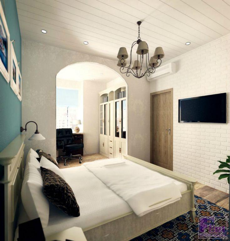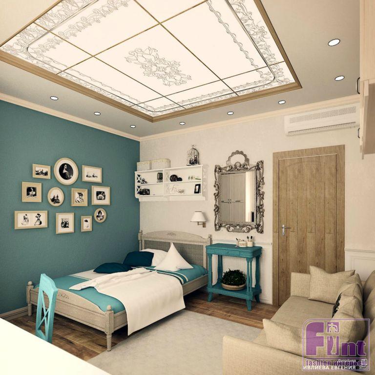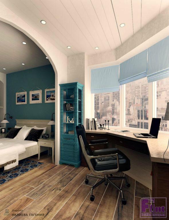 В спальне видим удобное рабочее место, состоящее из стола, мягкого кресла и вместительного шкафа для документов. Рабочее место расположено прямо у окна, что позволяет наполнить его естественным светом без особых усилий. Точечное освещение на потолке спальни пригодится в вечернее время. В детской комнате наблюдаем уже знакомую средиземноморскую стилистику. Комната щедро наполнена интересными мелочами, расставленными на полочках, и множеством картин. Картины выполнены в классической чёрно-белой гамме, которая смотрится контрастно на ярко-бирюзовой акцентной стене.