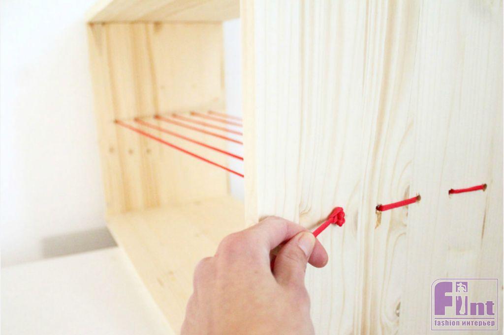 Собранный каркас дополняем внутренней «полочкой» из толстой бечёвки. Пропускаем бечёвку в первое отверстие и завязываем снаружи тумбы большой узел, чтобы бечёвка при натяжении не выскользнула из отверстия. Затем поочерёдно продеваем бечёвку в отверстия, чтобы у нас внутри тумбы получилась полка из 6 прочных и туго натянутых «струн». Если вы не уверены в прочности бечёвки, её можно сложить вдвое. Фиксируем бечевку в последнем отверстии аналогичным узелком, предварительно сделав хорошую натяжку.