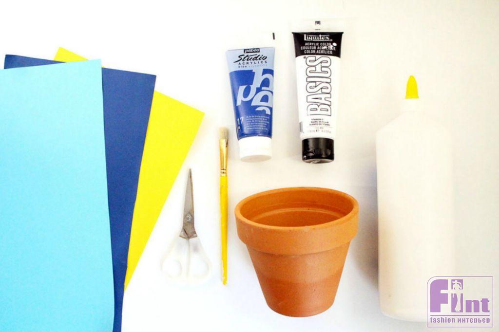 Скучные терракотовые глиняные горшки вряд ли украсят ваш дом. А вот такие необычные, яркие, пёстрые и жизнерадостные горшки точно станут отличным дизайнерским акцентом, тем более, что для их создания нам почти ничего не потребуется. Для изготовления цветочных горшков в мозаичной технике терраццо возьмём пару листов яркой цветной бумаги, грунтовочную краску белого цвета, акриловые краски нескольких цветов, клей для декупажа, ножницы, кисть и, конечно же, самые обычные глиняные горшки.