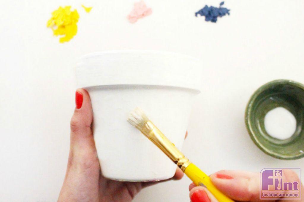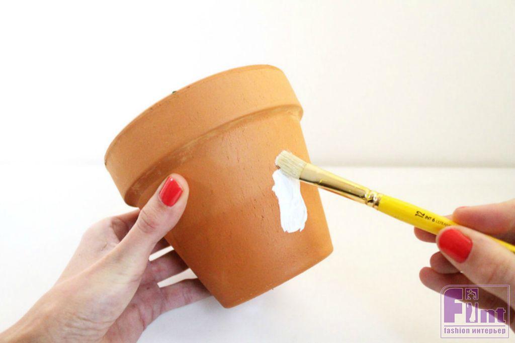 Сначала подготовим наши горшки и покроем их грунтовочным составом белого цвета. Делать это нужно в первую очередь, чтобы наши горшки успели подсохнуть и быть готовыми к последующему декорированию.