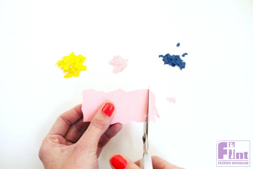 Затем с помощью ножниц нарезаем цветную бумагу на кусочки с геометрически прямыми сторонами. Такие цветные многоугольники будут имитировать каменные осколки, которые вдавливают в раствор, создавая бесшовные полы в технике терраццо. Нарезанных бумажных фрагментов нам понадобится много, поэтому не жалейте бумаги и сил. Один лист формата А4, полностью превращённый в мелкие фрагменты от 0,5 до 2 см в диаметре – то что нужно.