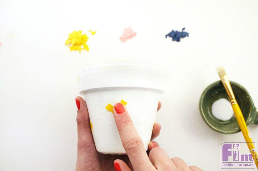 С помощью клея для декупажа наносим нарезанные цветные кусочки на внешнюю поверхность горшка, заполняя пространство таким образом, чтобы создавалось ощущение мозаичного полотна. Внешние углы на одних фрагментах нарезанной бумаги должны совпадать с похожими внутренними углами других фрагментов.