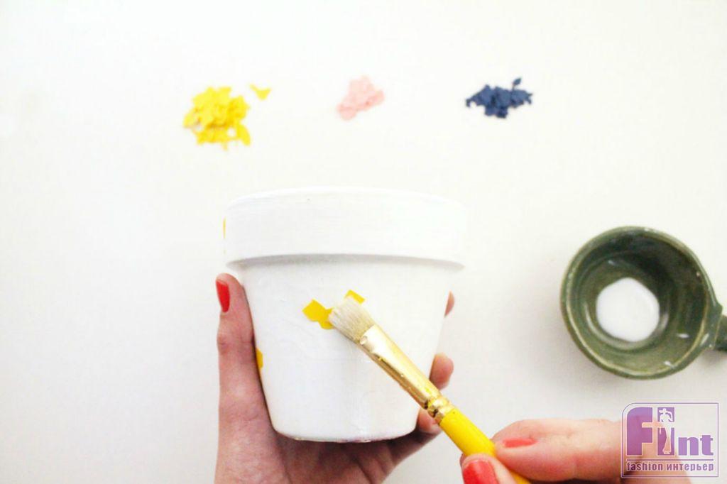 После того, как вся поверхность горшка будет покрыта цветными фрагментами, сверху их необходимо закрепить слоем клея для декупажа. На каждом горшке нам необходимо использовать цветные фрагменты 3-х различных оттенков и цветов.