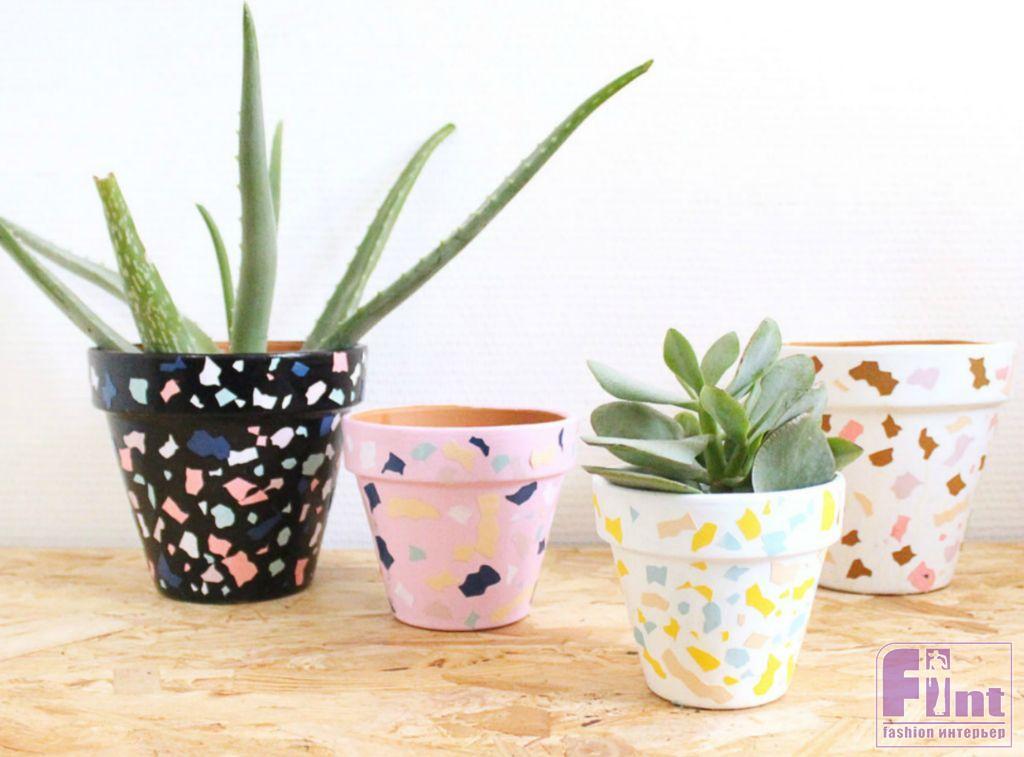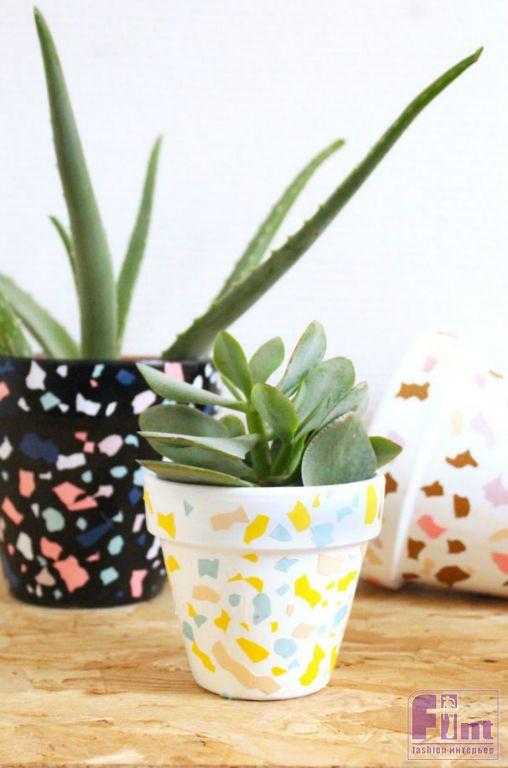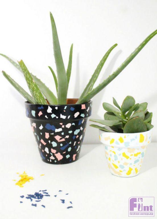 Удивительная техника создания наливных бесшовных полов терраццо (terrazzo alla veneziana) известна нам с XII века. Особого внимания эта техника добилась в следующие столетия. В это время полы в технике терраццо украсили многочисленные дворцы итальянской знати. За прошедшие столетия эта техника не утратила актуальности и стала довольно стильным решением для внутренней отделки квартир и загородных домов. Сегодня мы предлагаем вам сделать имитацию этой замечательной итальянской техники и применить её на цветочных горшках!