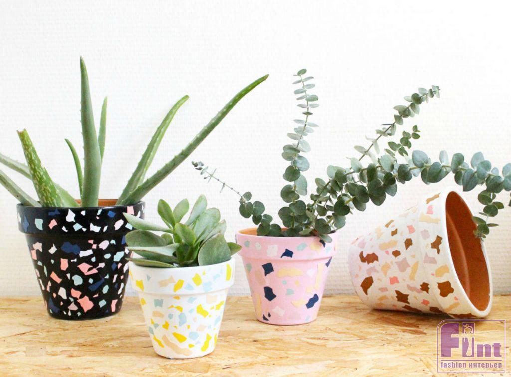 После того, как клей для декупажа высохнет полностью, наши горшки готовы к эксплуатации по своему прямому назначению! Осталось посадить в горшки красивые живые растения и у вас в доме появится миниатюрный сад с невероятно красивыми мозаичными горшками в технике итальянского терраццо.