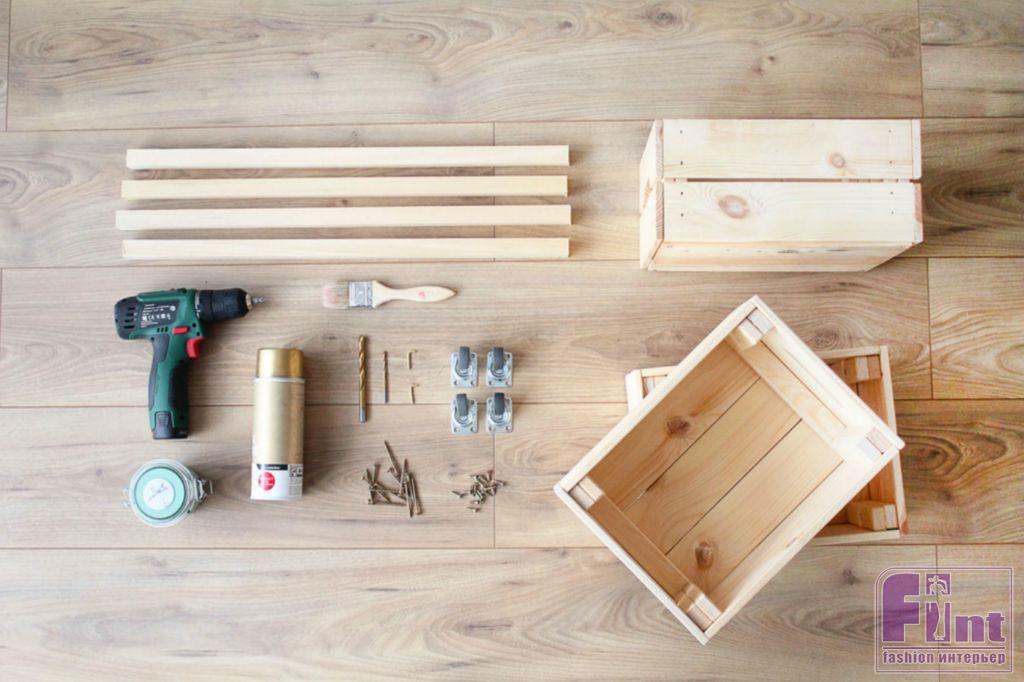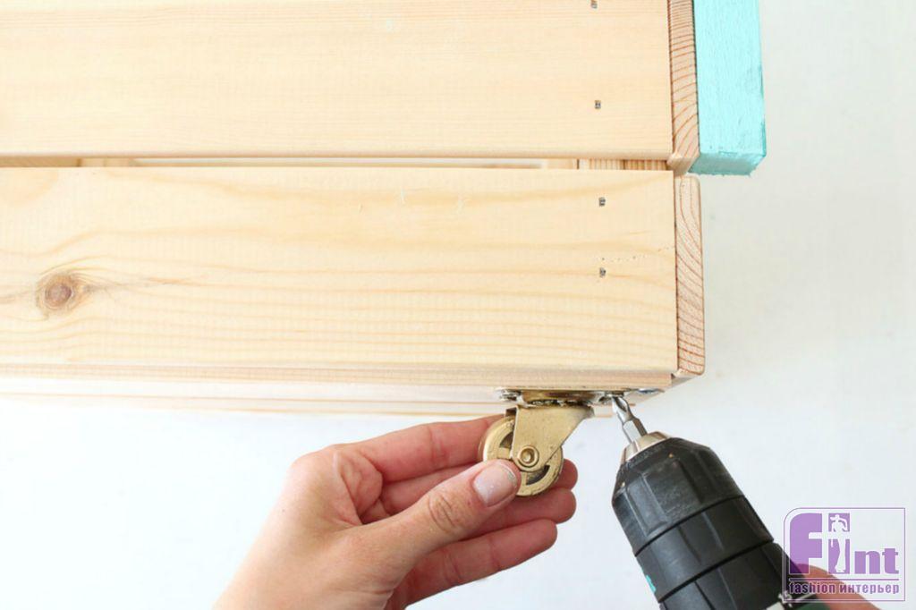 Аэрозольная краска сохнет достаточно быстро, поэтому уже через 20-30 минут мы можем прикрутить наши колёсики к дну нижнего ящика с помощью небольших саморезов. Старайтесь расположить колёсики ровно относительно углов ящика, чтобы конструкция ровно стояла на полу.