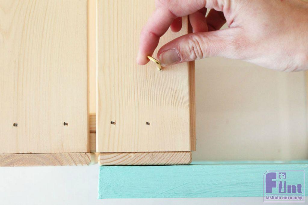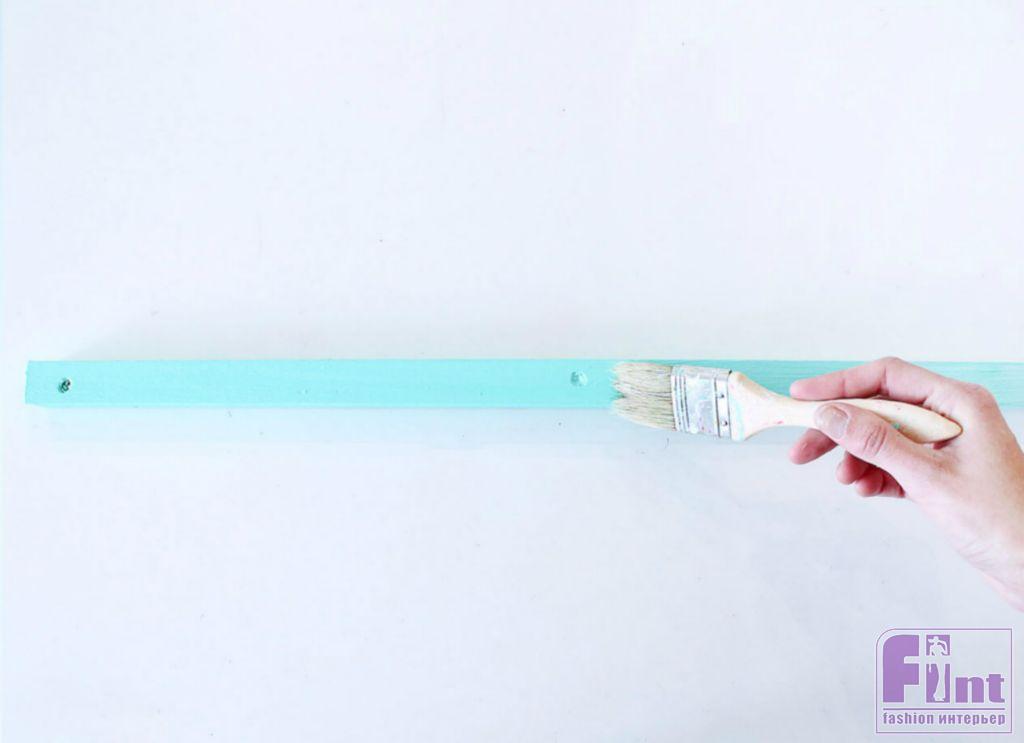 С помощью обычной малярной кисточки окрашиваем наши рейки в яркий бирюзовый цвет. Кстати, вы можете использовать любой цвет и оттенок, подходящий под ваш интерьер. Окрашивание лучше всего проводить в два – три слоя, выжидая время для высыхания между слоями. Так краска ляжет ровнее и будет лучше держаться на дереве.