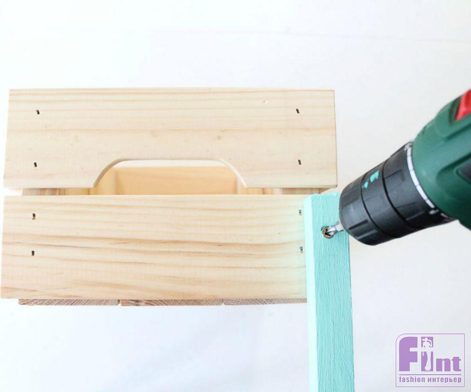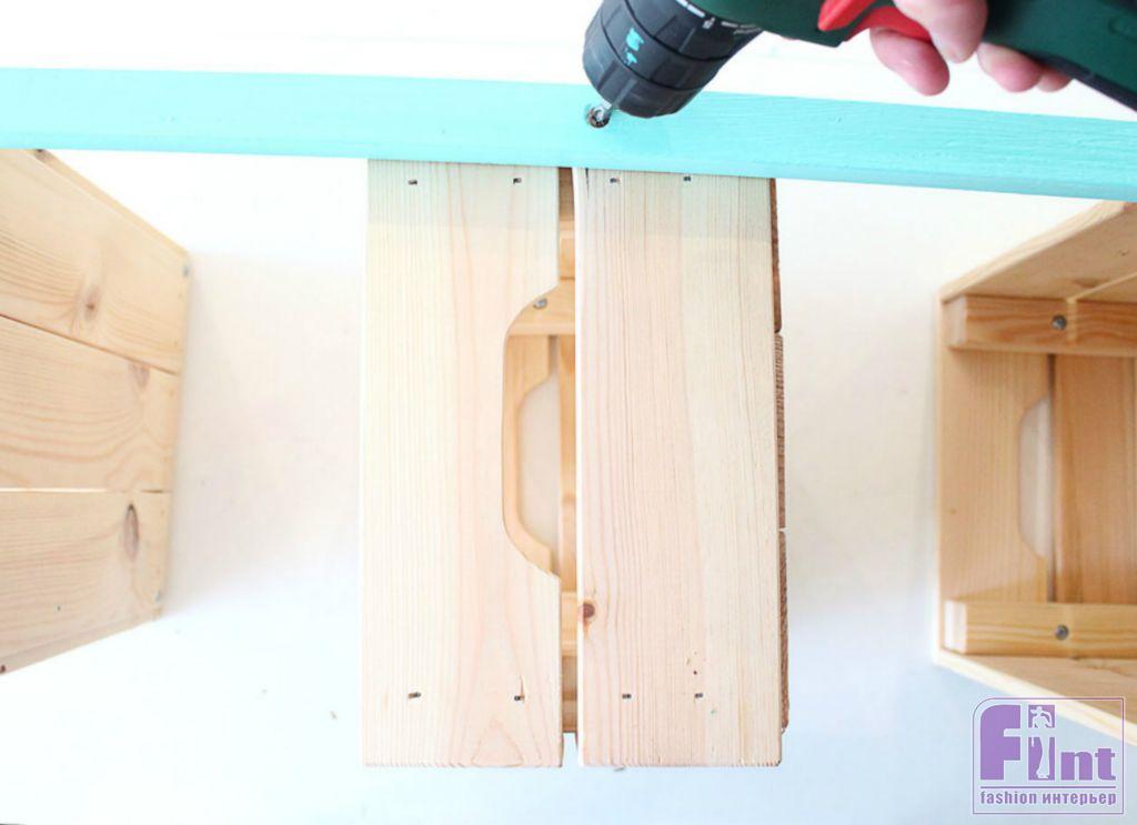С помощью длинных шурупов собираем конструкцию этажерки, соединяя рейками три ящика. Следите, чтобы ящики были закреплены на рейках ровно перпендикулярно, без перекосов. Чтобы получилось ровно, делайте на рейках отметки по высоте крепления ящиков.