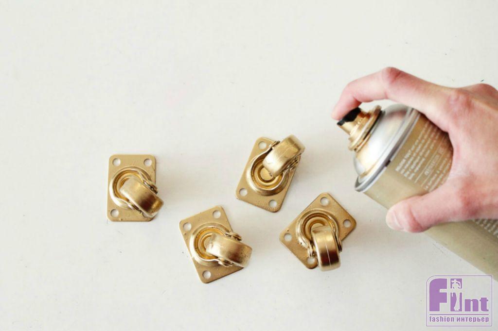 Мебельные колёсики мы окрасим в золотой цвет, используя аэрозольную краску. Выполняйте окрашивание на свежем воздухе, или в хорошо проветриваемом помещении! При необходимости используйте средства защиты.