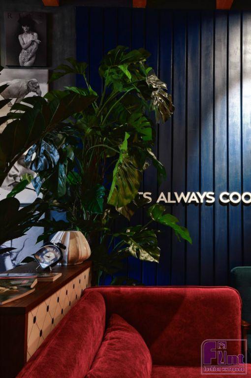 Из-за весьма скромных размеров помещения, для релиза REDCUPXMAXIMGORKY все предметы мебели и детали интерьера были изготовлено «под проект». Мебель делали по чертежам Артемия Саранина, светильники также выполнены по эскизам дизайнера. Фасады комодов, по замыслу автора, украсили фотопечатью со стильными геометрическими паттернами.